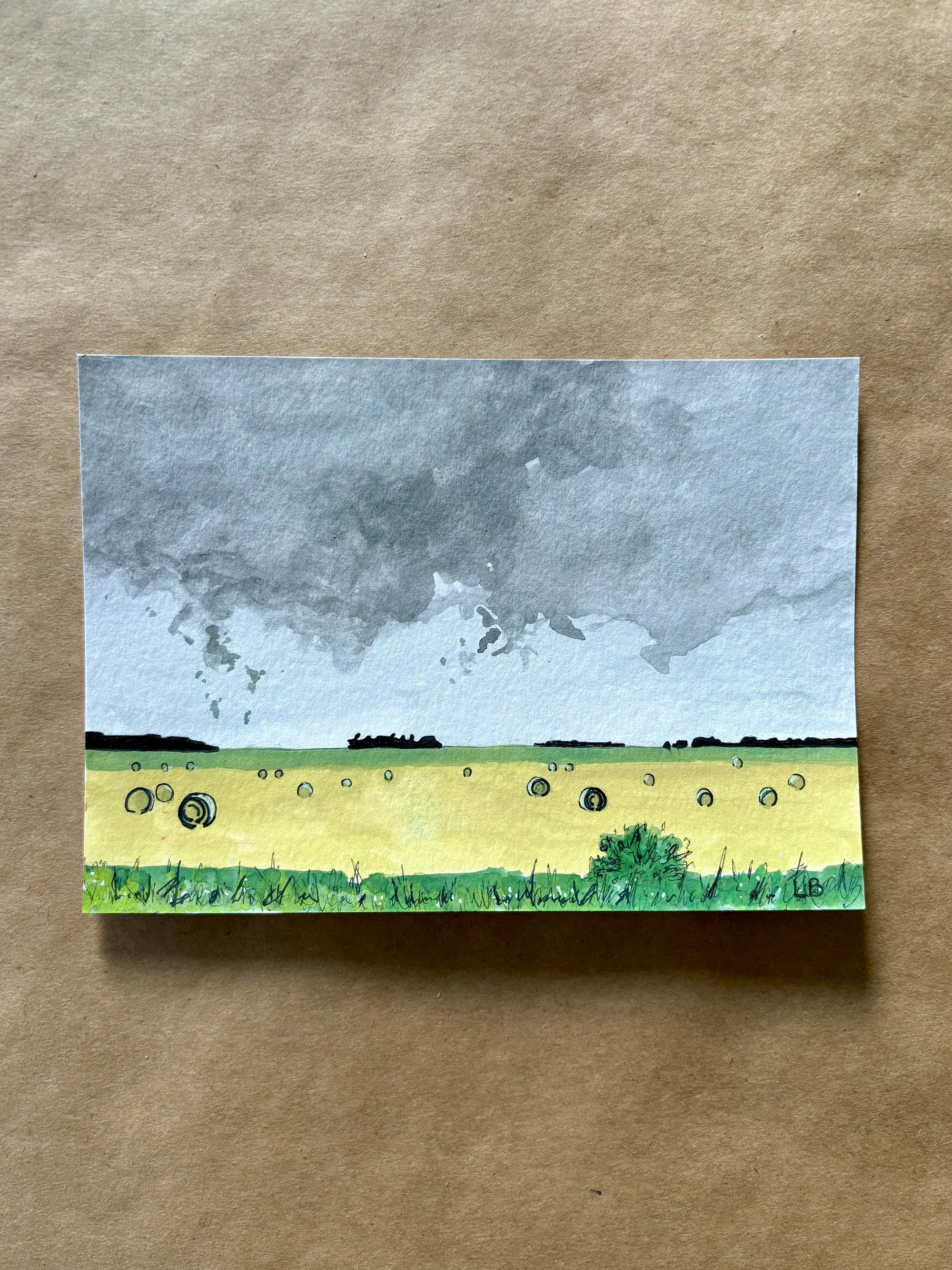 Mini gouache and ink paintings on heavyweight 140 lb paper. Each piece is a unique snapshot of the prairies.