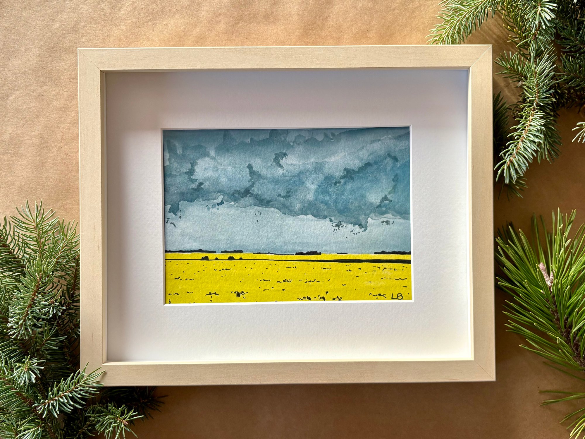 Mini gouache and ink paintings on heavyweight 140 lb paper. Each piece is a unique snapshot of the prairies.